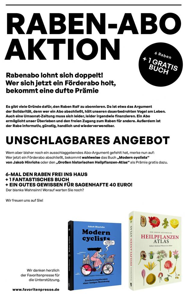 Wer ein Abo abschließt, hält den Raben Ralf am Leben. Auch eine Umsonst-Zeitung muss sich finanzieren. Mit einem Abo ermöglichen Sie unser Überleben und den freien Zugang zum Raben für andere. Vielen Dank!