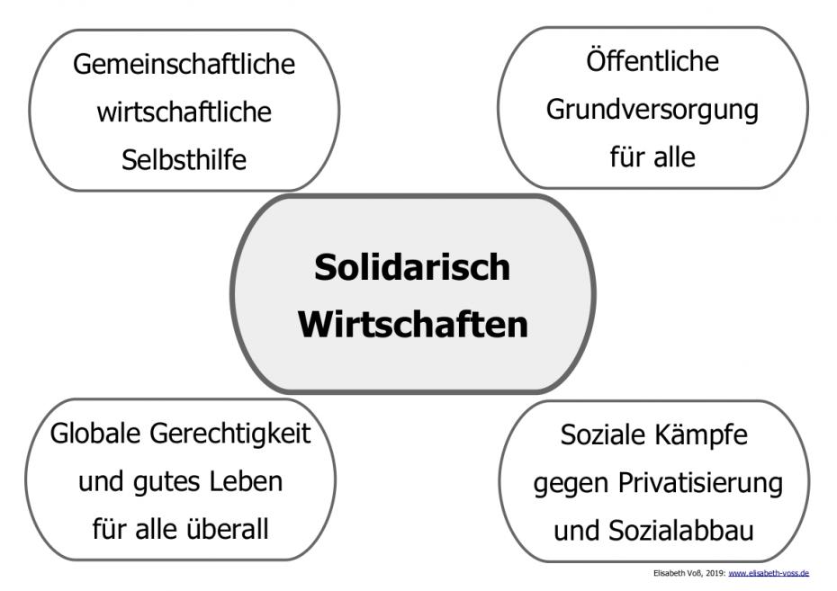 Zum solidarischen Wirtschaften gehören daher auch soziale Kämpfe gegen die Privatisierung und zur Rekommunalisierung der sogenannten Daseinsvorsorge. Und weil in einer globalisierten Welt letztlich alles mit allem zusammenhängt, stellt sich gleichzeitig die Frage, wie ein gutes Leben für alle überall möglich sein kann – unabhängig von geografischer und sozialer Herkunft, Geschlecht, Leistungsfähigkeit etc. Eine Solidarische Ökonomie in diesem Sinne braucht unbedingt die Perspektive globaler Gerechtigkeit.